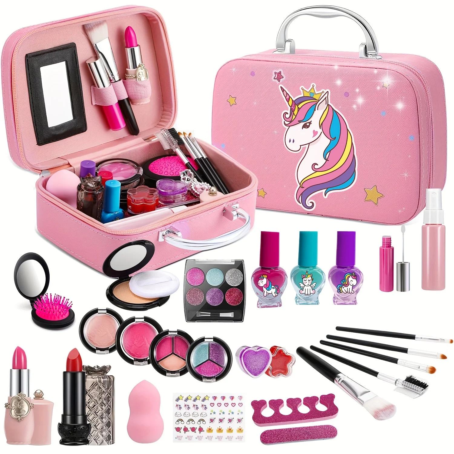 Delight your little one with this Luxury Unicorn Makeup Set Suitcase for Girls. Designed with a magical unicorn theme, this makeup kit is perfect for sparking imagination and creativity. The suitcase-style design makes it easy to carry and store, so kids can take it anywhere. Inside, you’ll find a variety of safe, washable, and child-friendly cosmetics that look and feel just like real makeup. The set includes essentials like lipsticks, eyeshadows, blush, and brushes, giving kids the full beauty experience. Its bright unicorn design adds a touch of fantasy, making it extra fun for pretend play. Perfect for birthday parties, playdates, or dress-up, it encourages role play and boosts confidence. Parents will appreciate that the materials are non-toxic, safe, and easy to clean. The compact design keeps everything organized, teaching kids responsibility while they play. This kit also helps improve hand-eye coordination and fine motor skills. Whether your child is pretending to be a little stylist or playing princess, this set creates hours of fun. It’s great for solo play or sharing with friends, encouraging creativity and social interaction. A perfect birthday, holiday, or special occasion gift, this Luxury Unicorn Makeup Set will make any little girl feel like a star.
